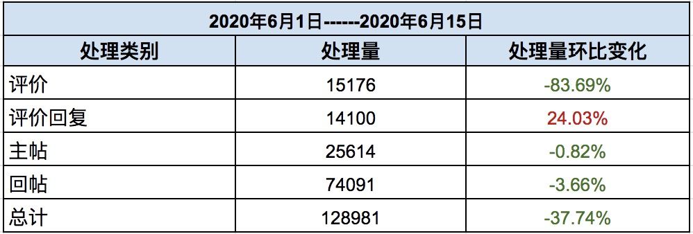 六月上半月内容处理量为128981条,平均每日处理内容8598.7条,本期处理量的数据变化可以参考封禁账号的变化,均是因为处理的水军账号的数量带来的同步下滑,值得注意的是评价回复处理量有近四分之一的增长,小管家希望活跃在评价区的Taper们一定要时刻注意自己的言行哦,面对相悖的意见一定要理智探讨,面对过激的言语举报拉黑远胜过上头对喷玉石俱焚~