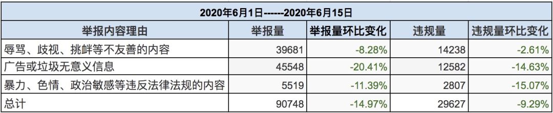 六月上半月禁言总量543,同期有显著增长,增长构成主体还是发布“发布不友善、攻击性信息”的账号,天气闷热,难免心烦气躁,小管家希望小伙伴们还是要多多注意沟通上的方式,不要一言不合就言语相向;