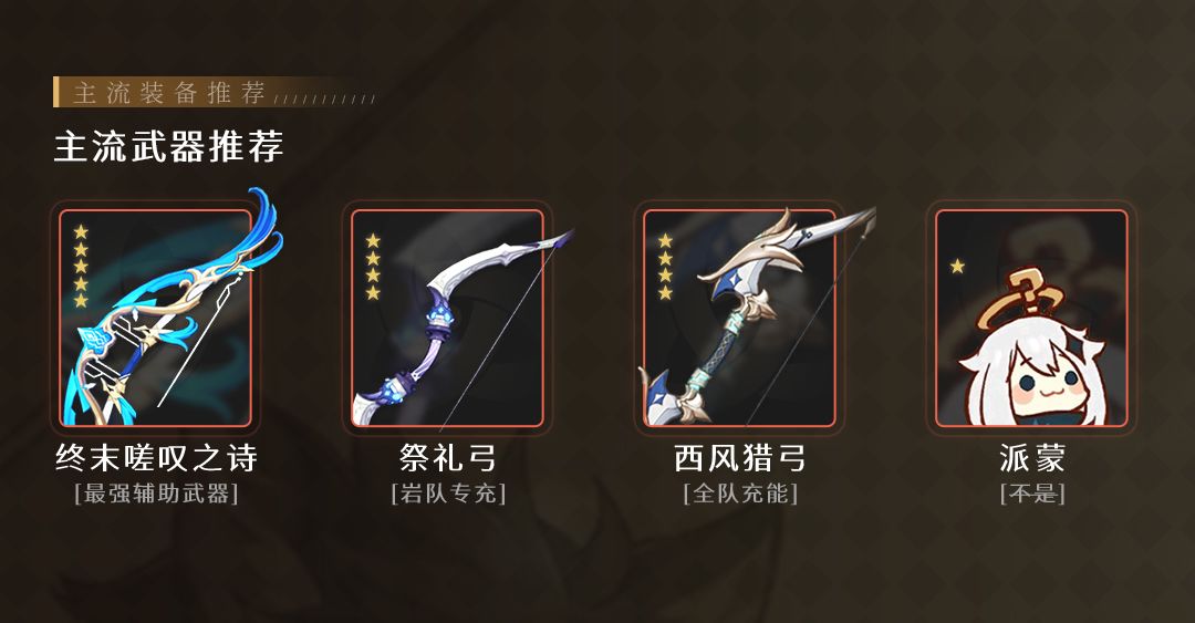 五星弓系辅助武器,主词条元素充能效率可以让五郎更容易开出元素爆发,终末被动可以为全队提供攻击加成以及元素精通,提高结晶盾厚度,以及蚊子腿伤害。在追求上限时,终末将会是无可替代的选择。