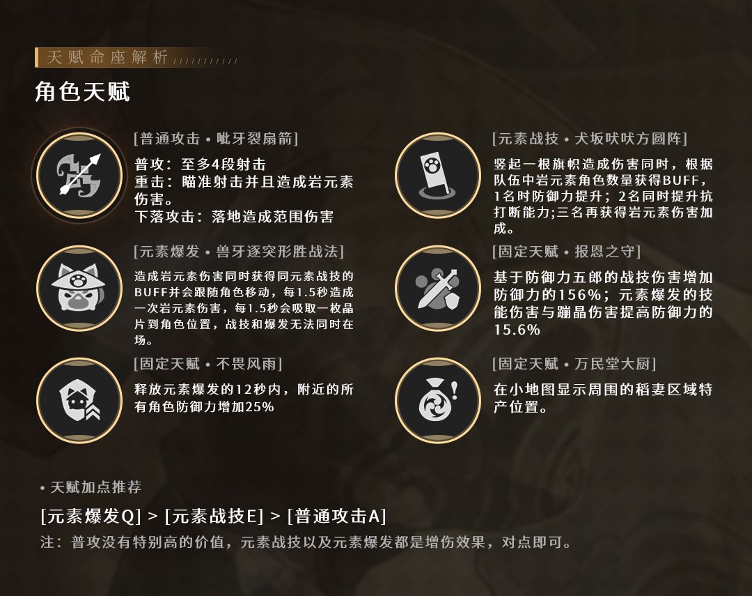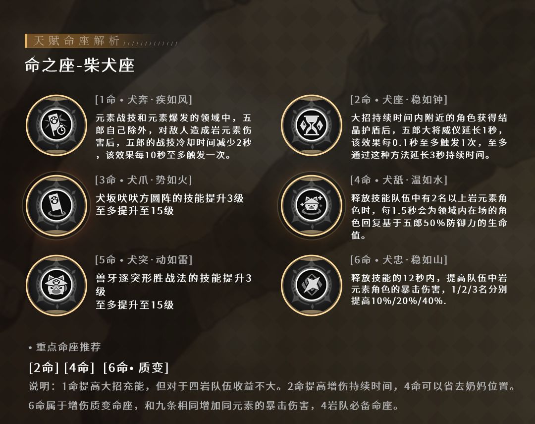 元素爆发在队伍中存在2名以上岩元素角色时,会每隔1.5秒基于五郎50%的防御力,为当前场上角色恢复生命值。算是一个质变效果,但是奶量太低,行秋水平,不一定够用,额外配置奶妈的话则相当于无用命座。