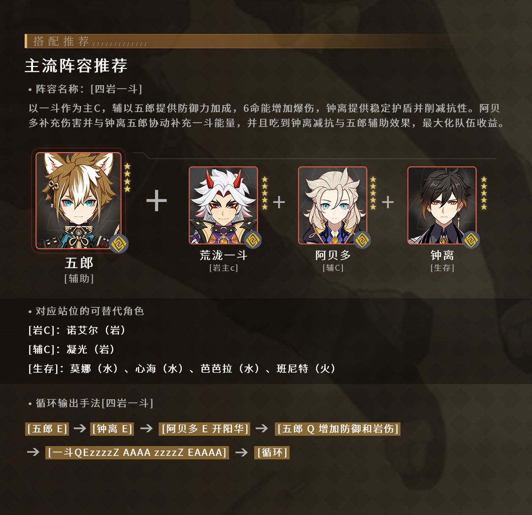 输出手法:五郎的机制比较简单,在主C爆发前开启元素爆发即可,如上队伍中存在阿贝多也需要吃五郎的buff加成的情况下,可以先用元素战技给阿贝多增加一次防御力,之后再次切出来开大招的领域为一斗提供伤害加成。