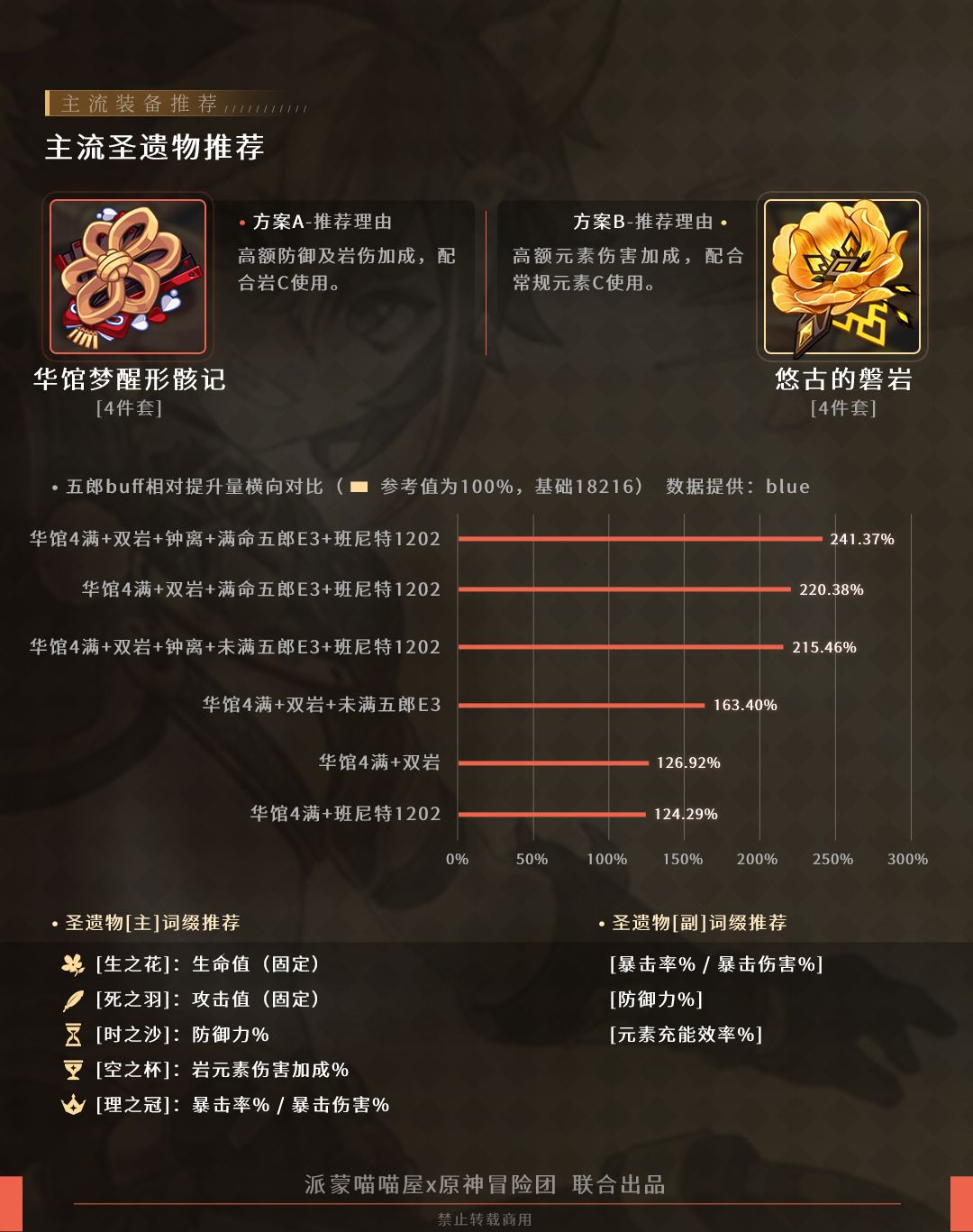 充能主词条,有助于五郎的充能循环。好处是一次E的释放就可以让充能效益发挥完全,不像祭礼需要多一个E的动作。由于需要暴击触发,所以五郎在面板上需要堆更多暴率。
