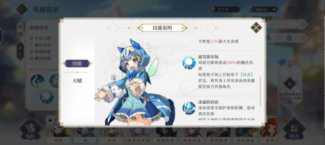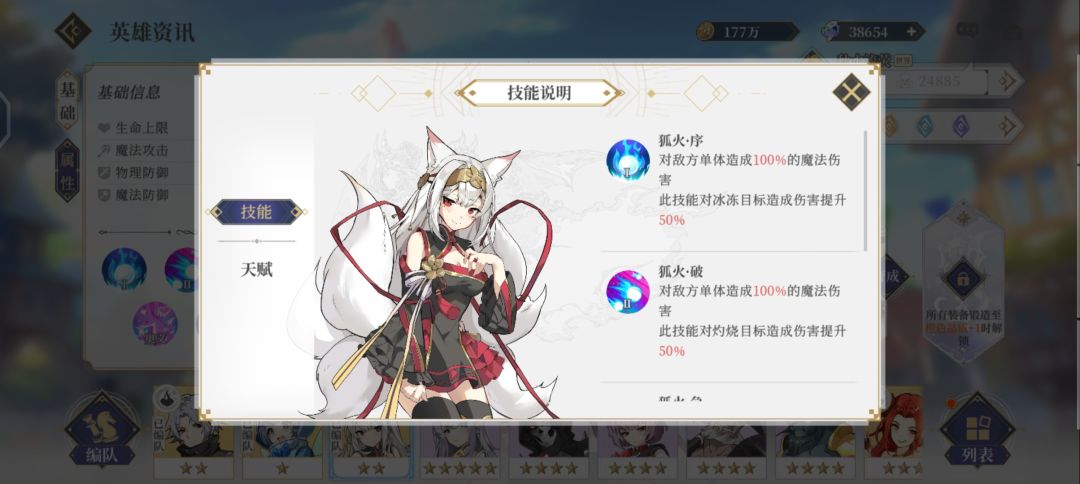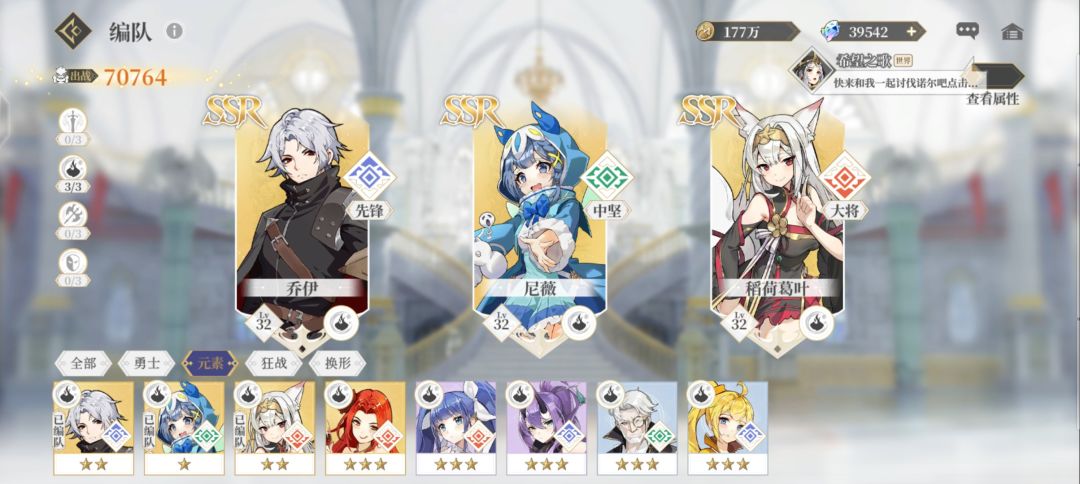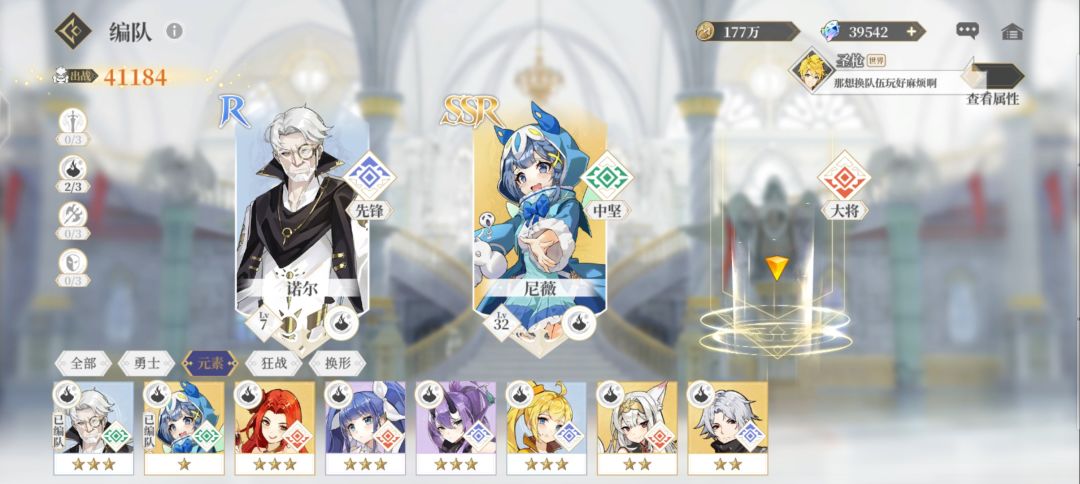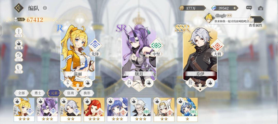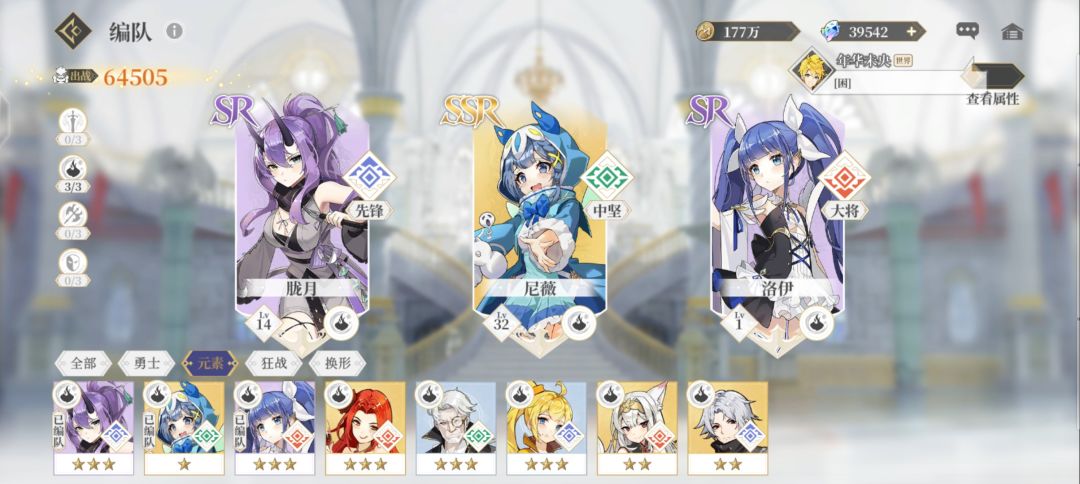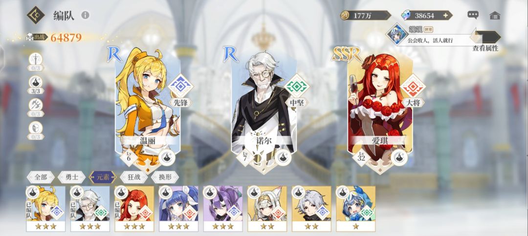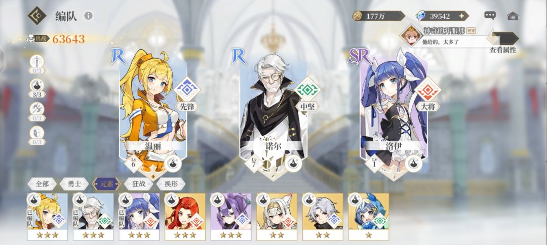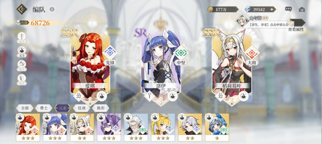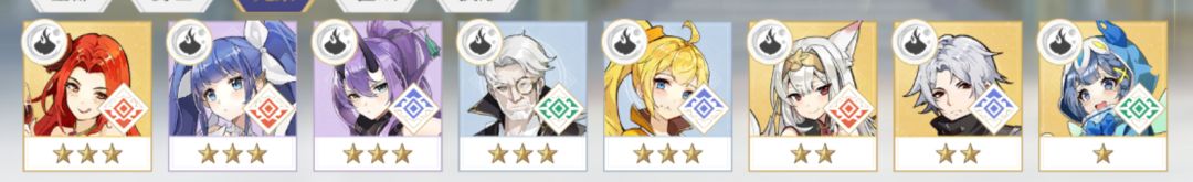 于是有了以下配队(元素队不同于其它系,前锋和中坚位挂状态的人物才是真正的主C,大将位反而是作为一个坦克苟活的作用)