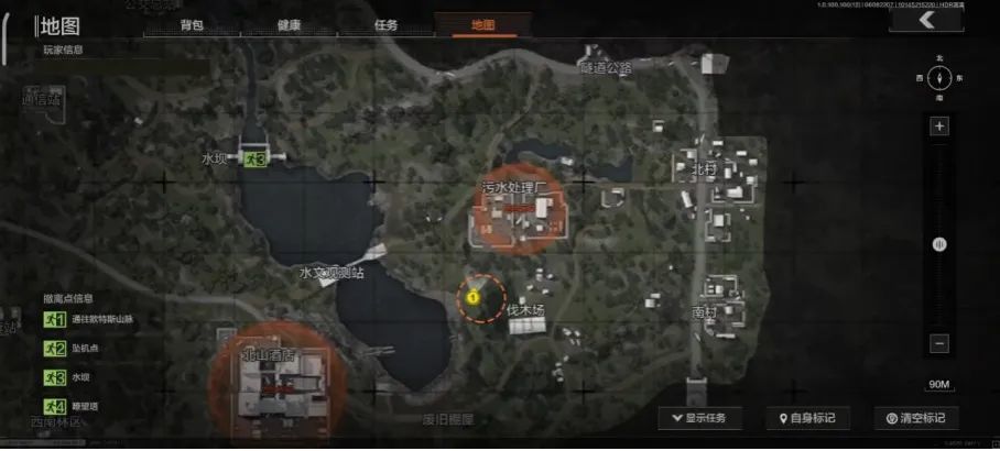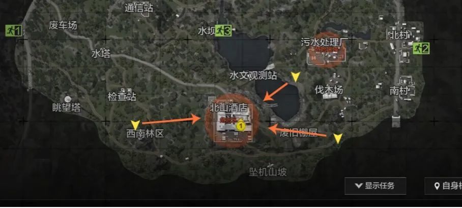 首先我们来看看北山的基本地形构造,北山地图中间偏东的地方有一大片人工湖,人工湖将北山地区分成东西两片区域。湖中间有一座水文观测站,也是连接东西两岸两个最重要资源点污水处理厂和北山酒店的重要通路。但是要注意,从这里经过很容易被在周围埋伏的敌人远程狙击。比如位于北边的水坝,这里视野开阔,而且有掩体。如果使用狙击枪配高倍镜,可以很轻易地收到过路费。另一个重要的制高点则是北山酒店南侧坠机山坡附近的高地。在这里架枪可以守住北山酒店的南侧入口,对从这里进出的玩家形成巨大威胁,也是一块兵家必争之地。