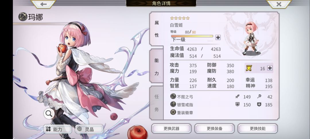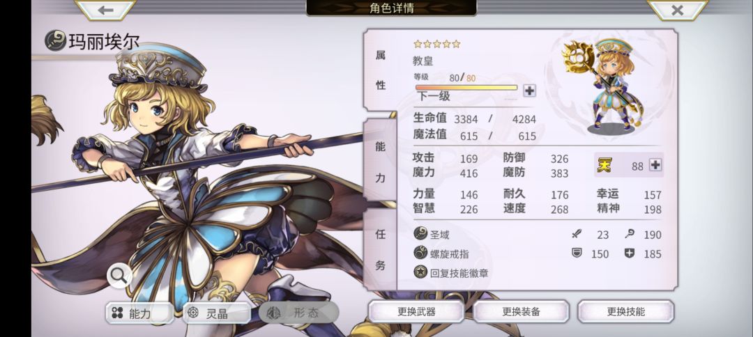 玛丽:三个中级hp杖,要觉醒,专武+好防具+回复徽章。不用控速,不过如果速度控制在211-269之间,容错率高一些