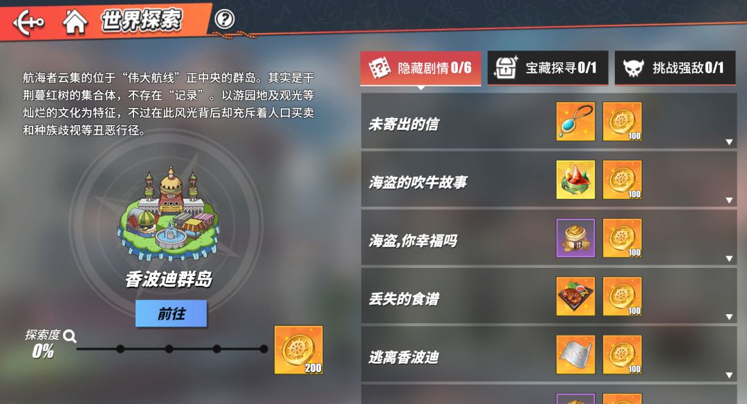 晒进度:评论回复晒出你的香波迪群岛探索进度截图,即有机会获得航线召唤礼包(含高级召唤券*1,贝里*20000)探索度越高,越容易获奖哦。