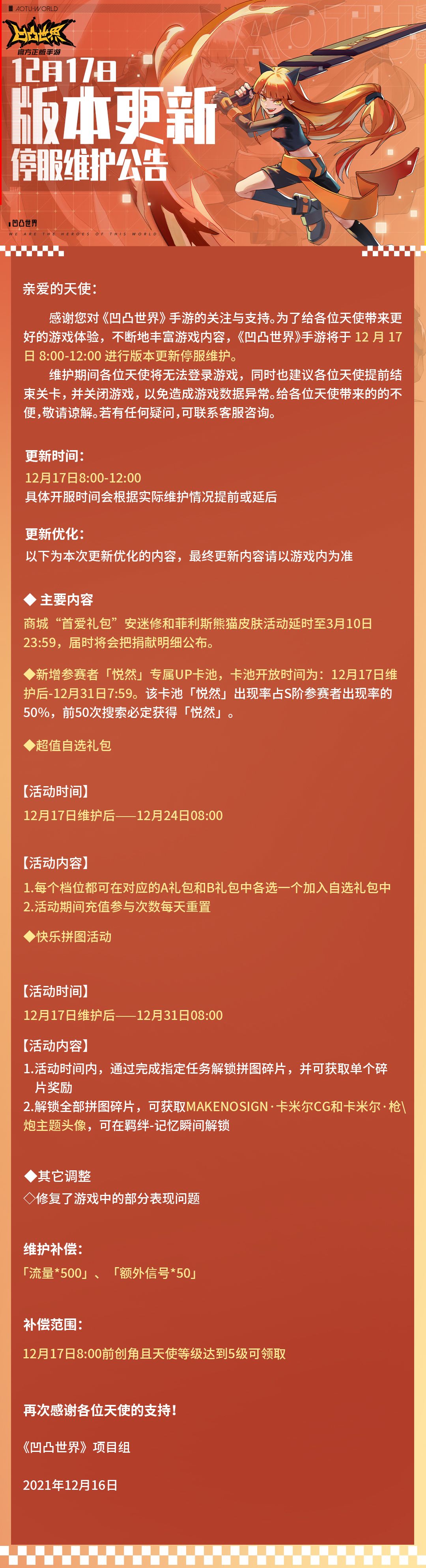 感谢您对《凹凸世界》手游的关注与支持。为了给各位天使带来更好的游戏体验,不断地丰富游戏内容,《凹凸世界》手游将于12月17日8:00-12:00进行版本更新停服维护。