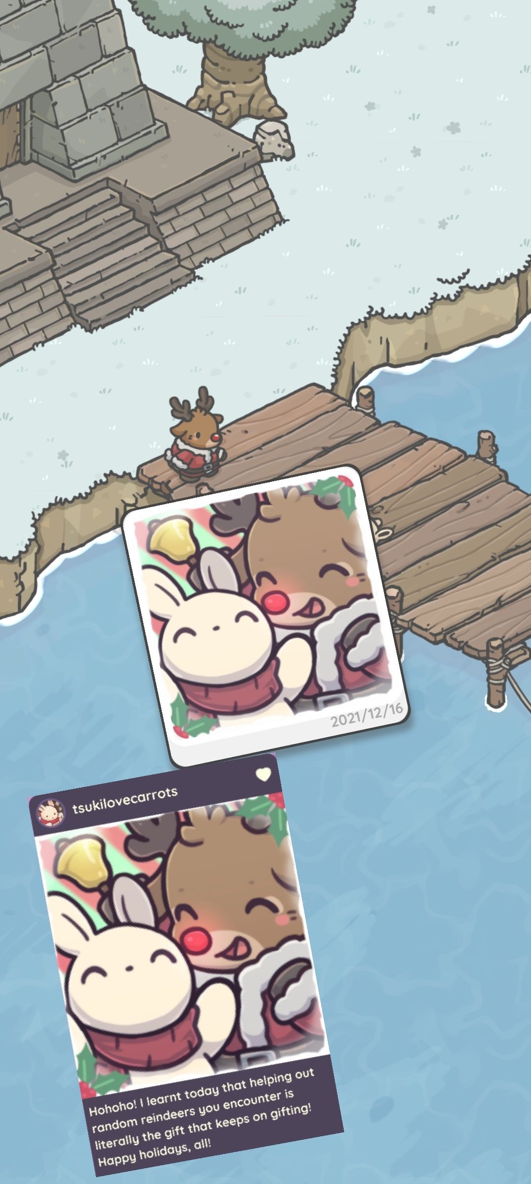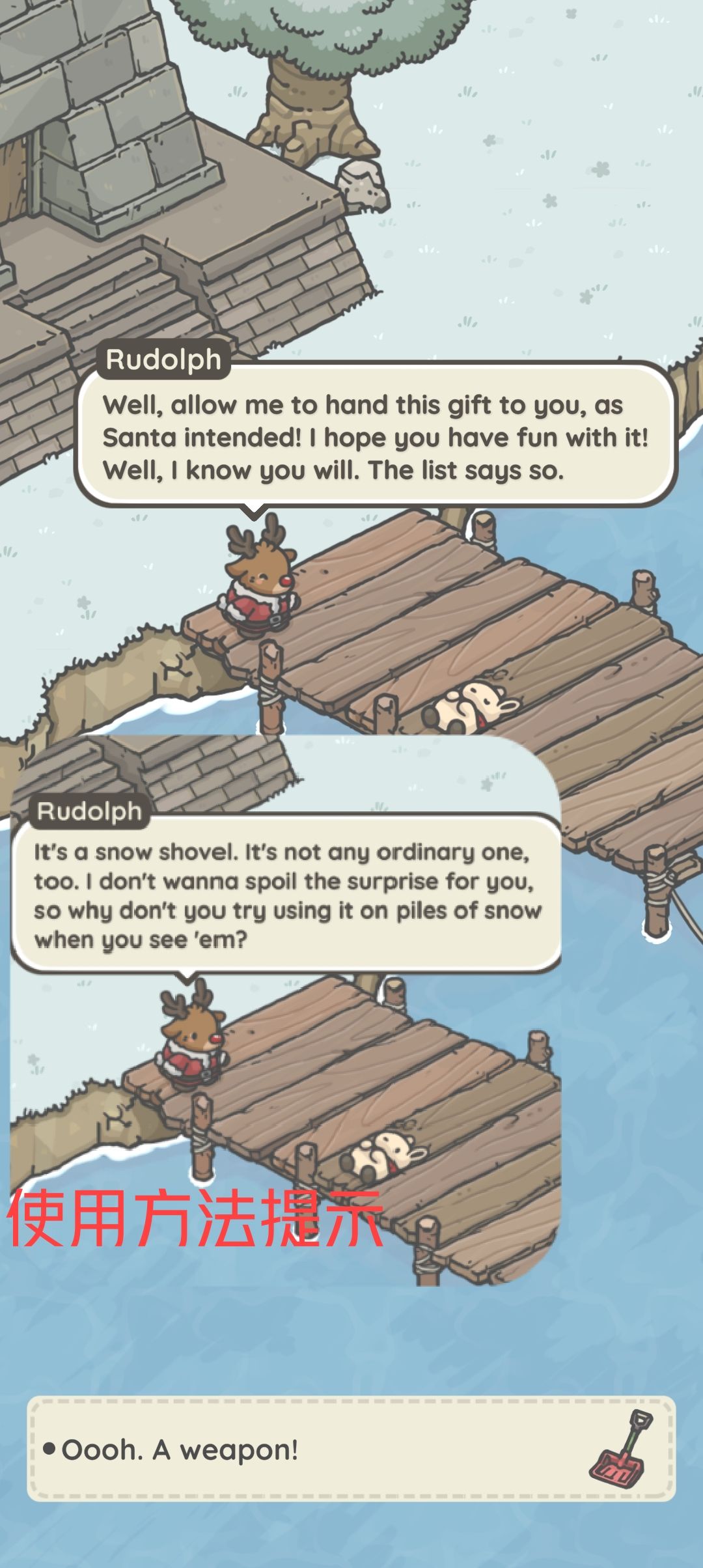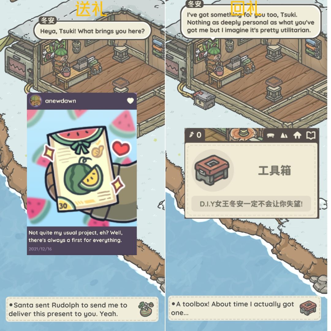完成送礼任务后与鲁道夫对话,获得奖励雪铲与一篇朋友圈。