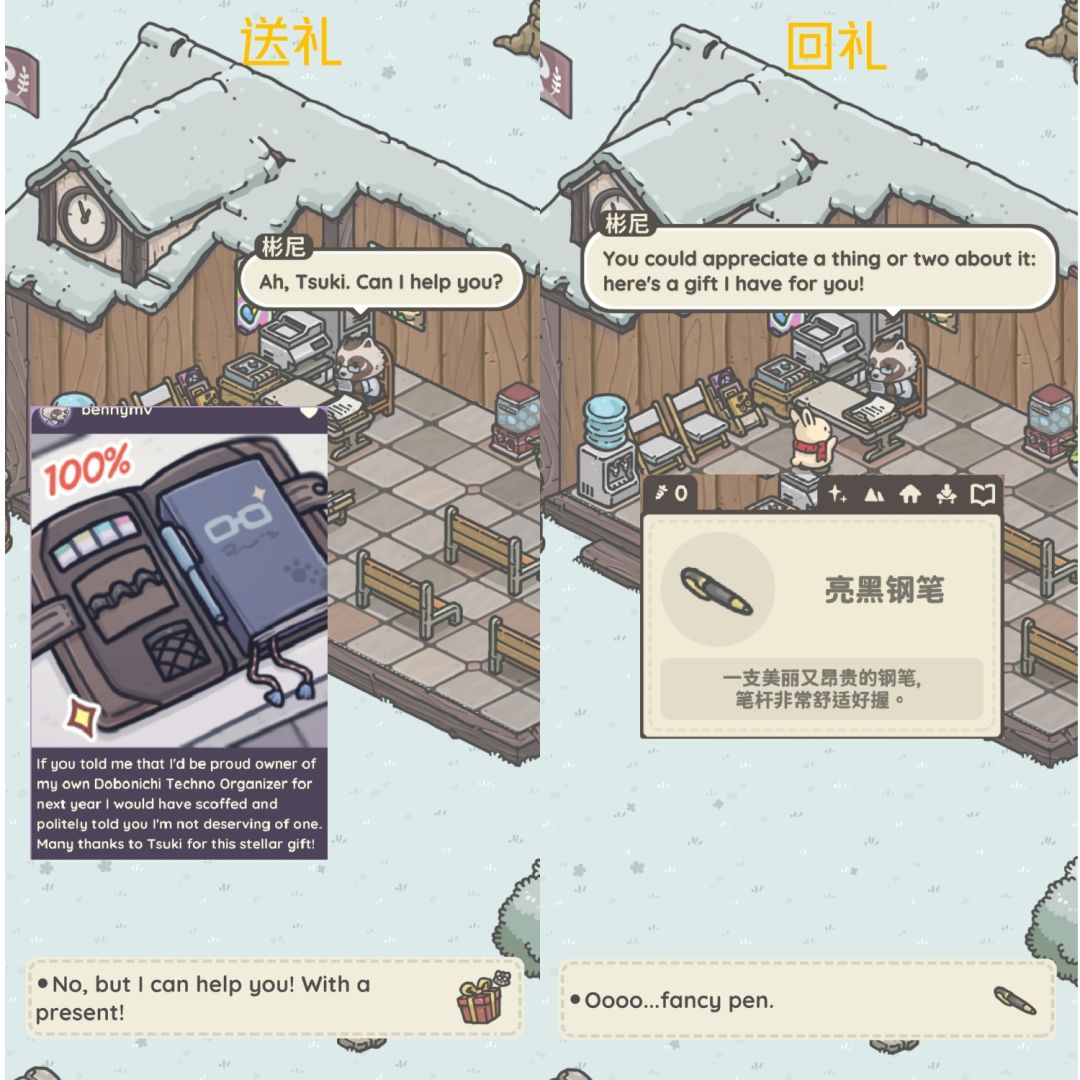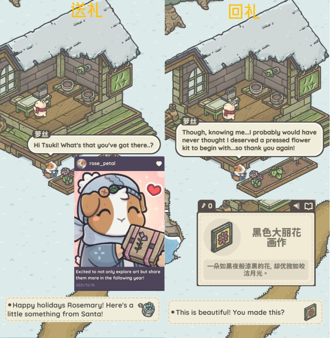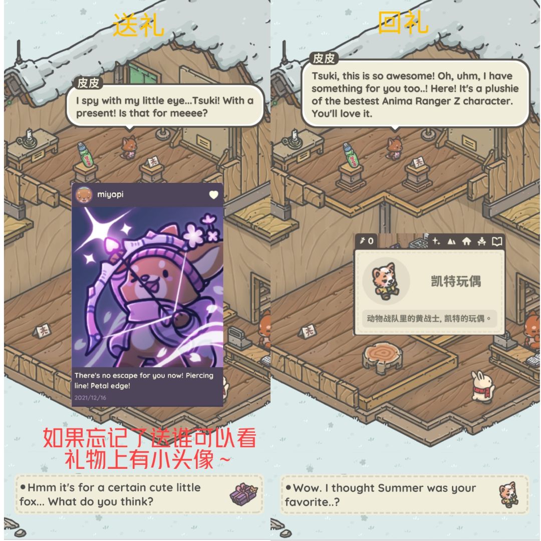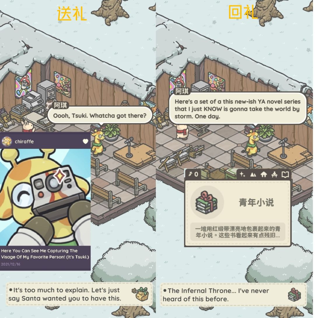 接任务后与礼物对应居民对话,可获得对应朋友圈与回礼。(看不懂英文看礼物上有头像,介绍)