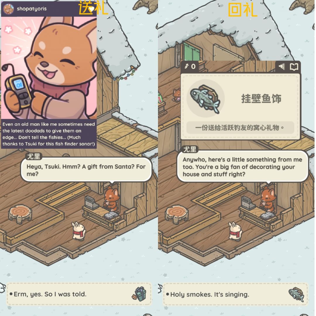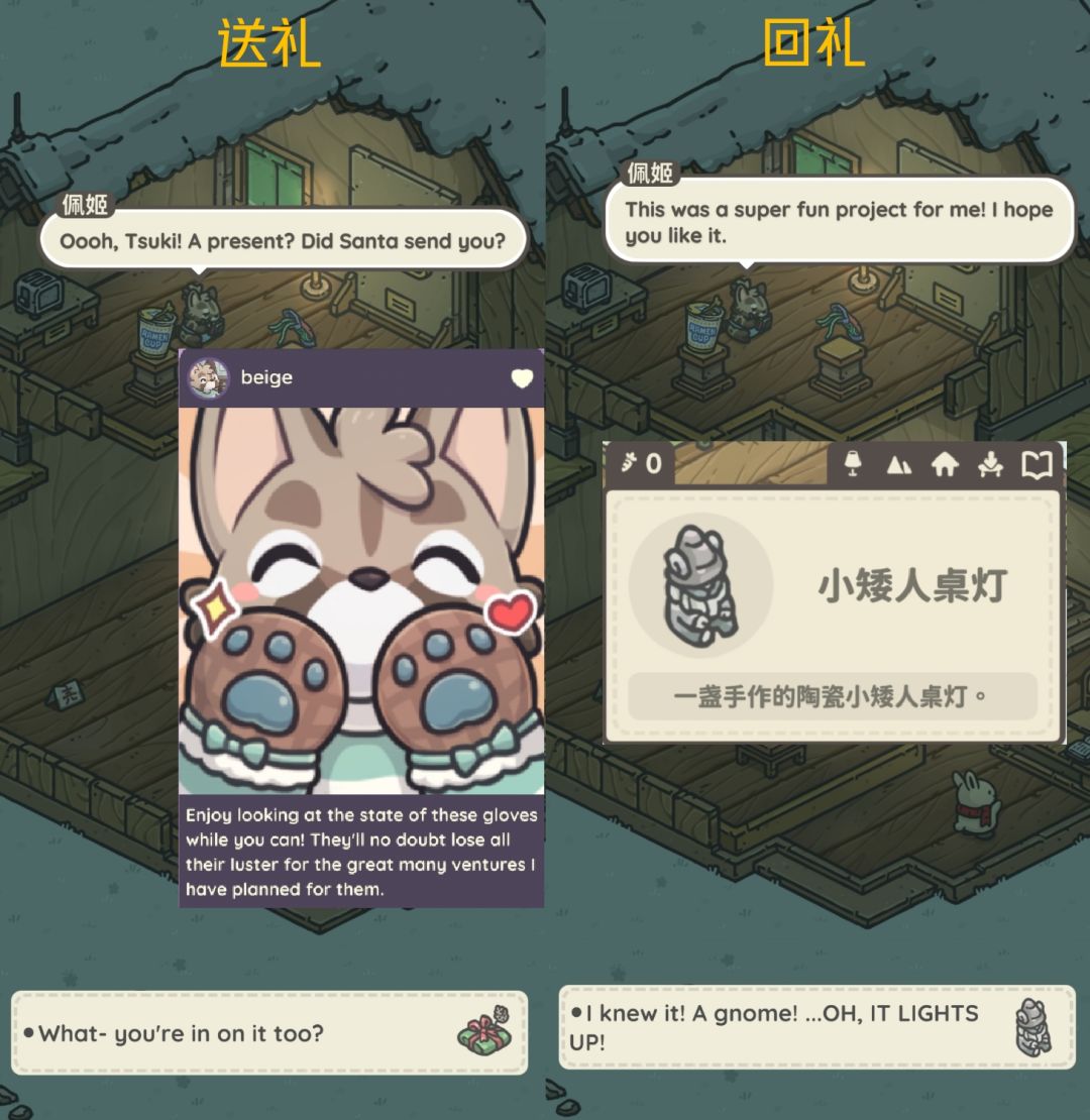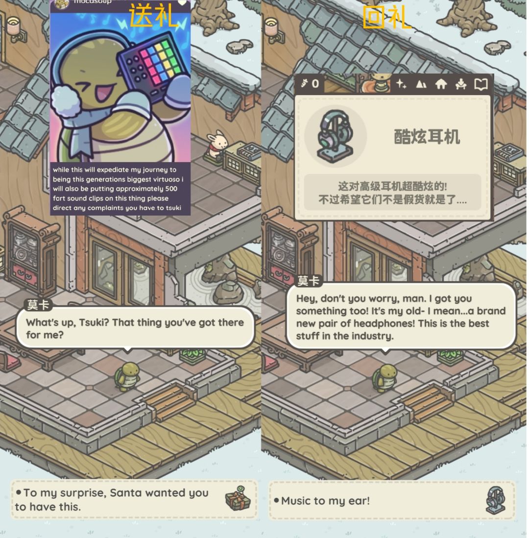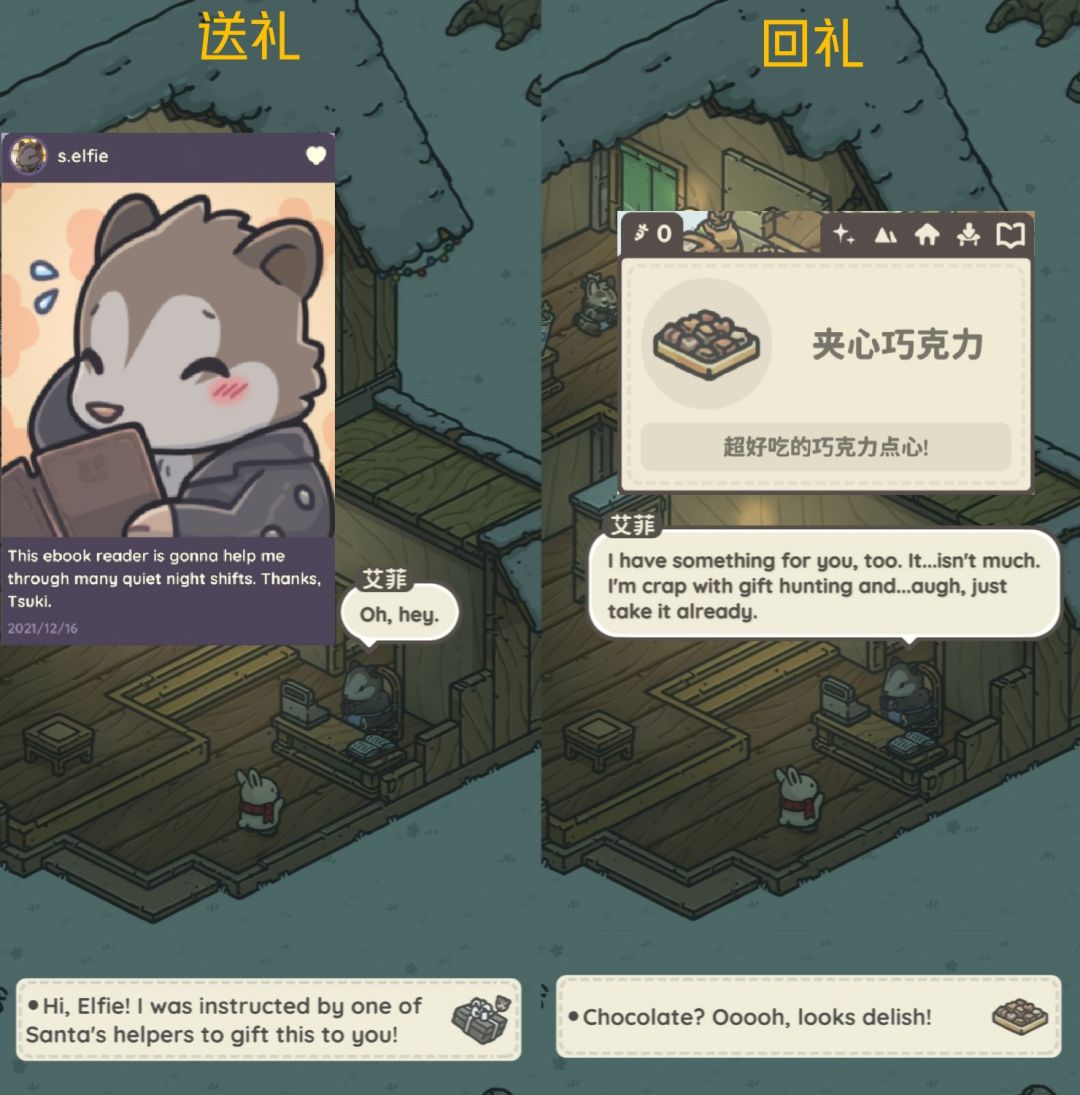 接任务后与礼物对应居民对话,可获得对应朋友圈与回礼。(看不懂英文看礼物上有头像,介绍)