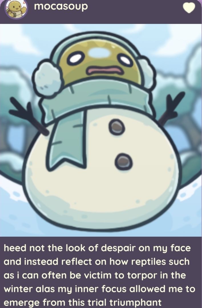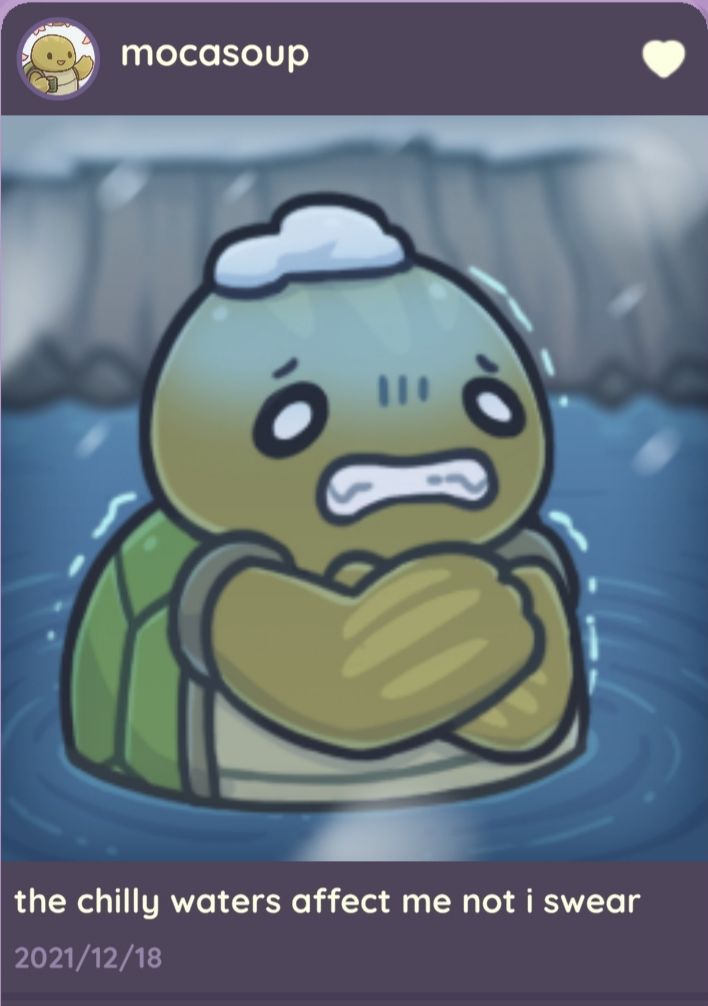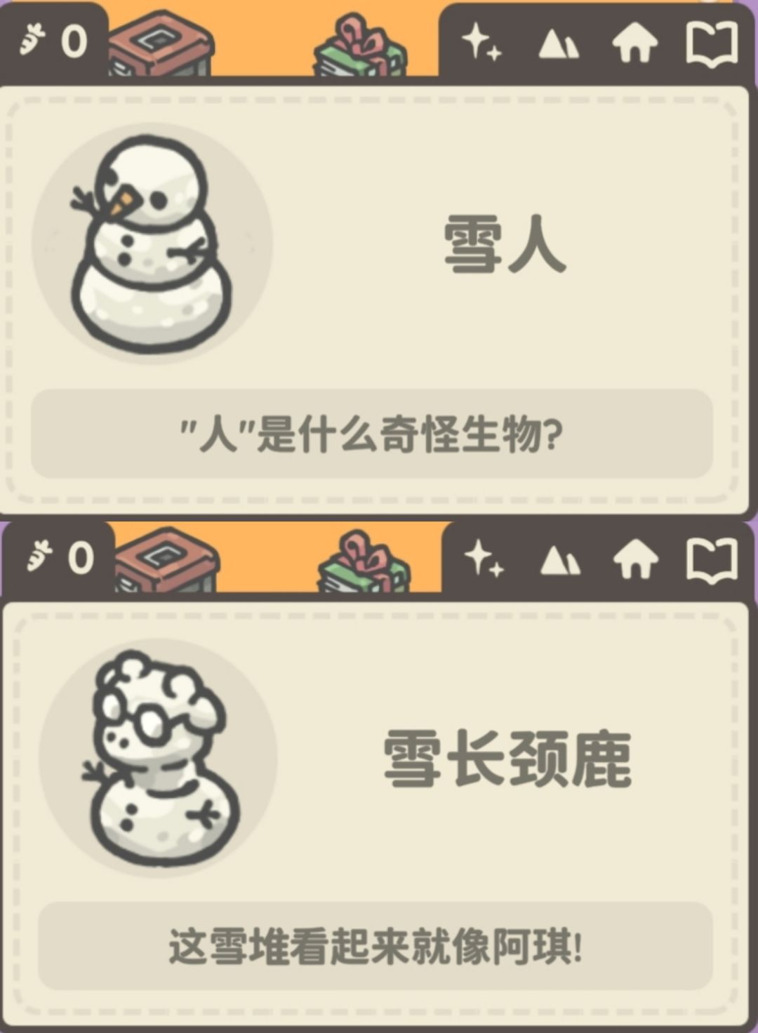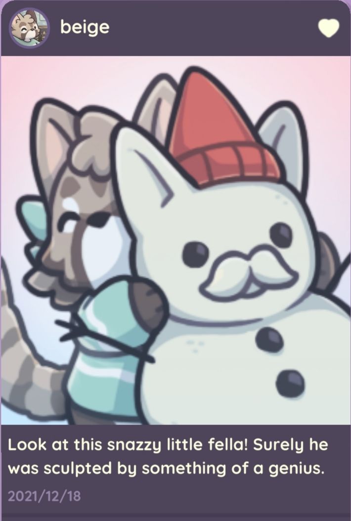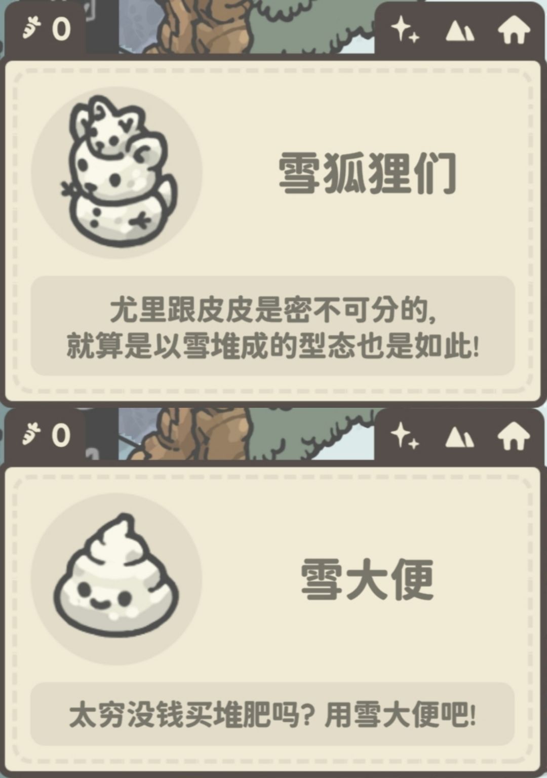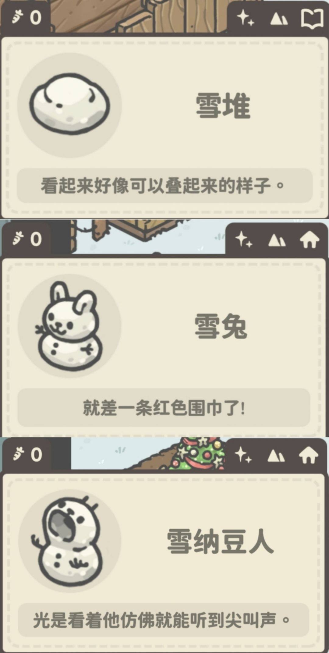 补充十三个朋友圈(84及以上版本即可获得)在胡萝卜地(参考地点)看到佩姬堆雪人,码头佩姬吃便当(傍晚),佩姬在酒馆平躺(下午5点多)。码头莫卡在游泳冻僵了(上下午?)!莫卡在自己家吃雪。莫卡在胡萝卜地变雪人。莫卡码头听歌(晚上)。尤里商店地上看到皮皮窝在雪堡里~屋顶也有一个朋友圈~还有让人破防的阿雅雪人…