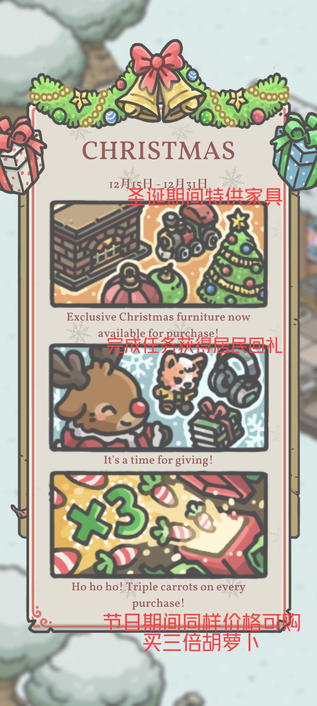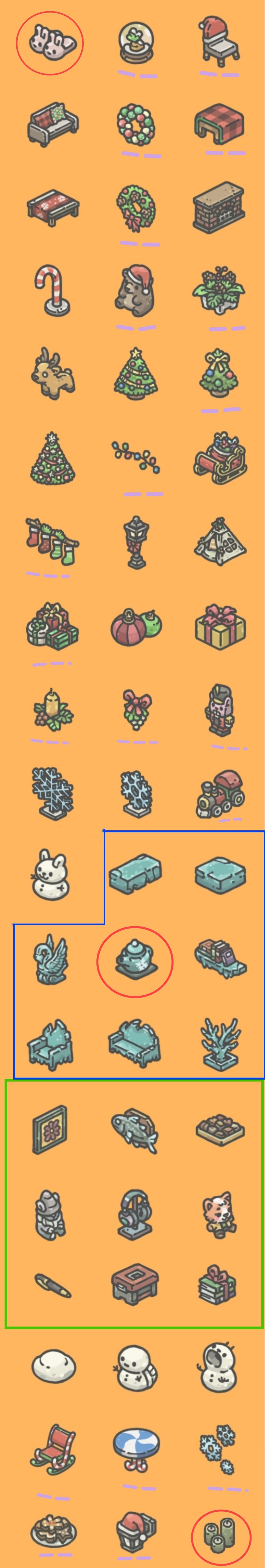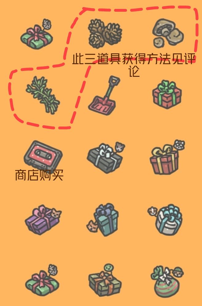 以下是目前获得的圣诞节道具(礼物由任务二获得)和家具(红圈获得方式见评论,紫色横线标注为礼盒开出来,雪人两个雪堆随机生成共九种,冰雕系列由签到七天抽奖获得,目前不全。绿框为任务二回礼),还有游戏官方活动宣传图。