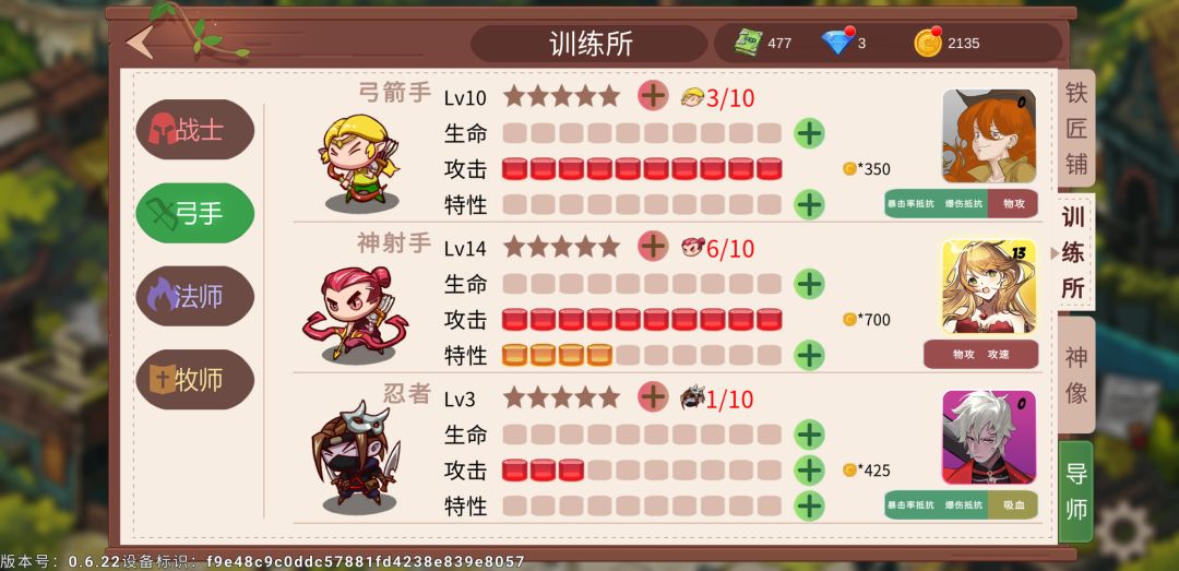 角色培养:只需要培养弓箭手就行了,其他的前期不用培养,花300金币解锁神箭手,优先升级攻击和特性到满级,最后升级生命;再有金币升级弓箭手攻击和神箭手的特性,特性加的属性,按住特性不动会显示加的属性。等到弓箭系列角色全部培养满,再考虑培养圣职和法师,这基本已经到大后期了。