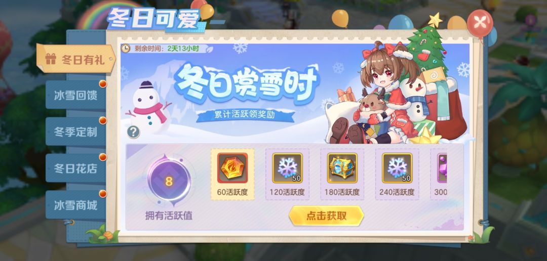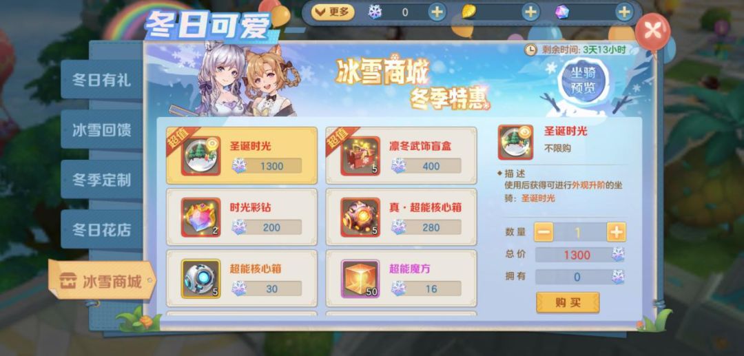 -通过冰晶雪花可以兑换圣诞时光坐骑、凛冬武饰盲盒、时光彩钻等珍惜道具~