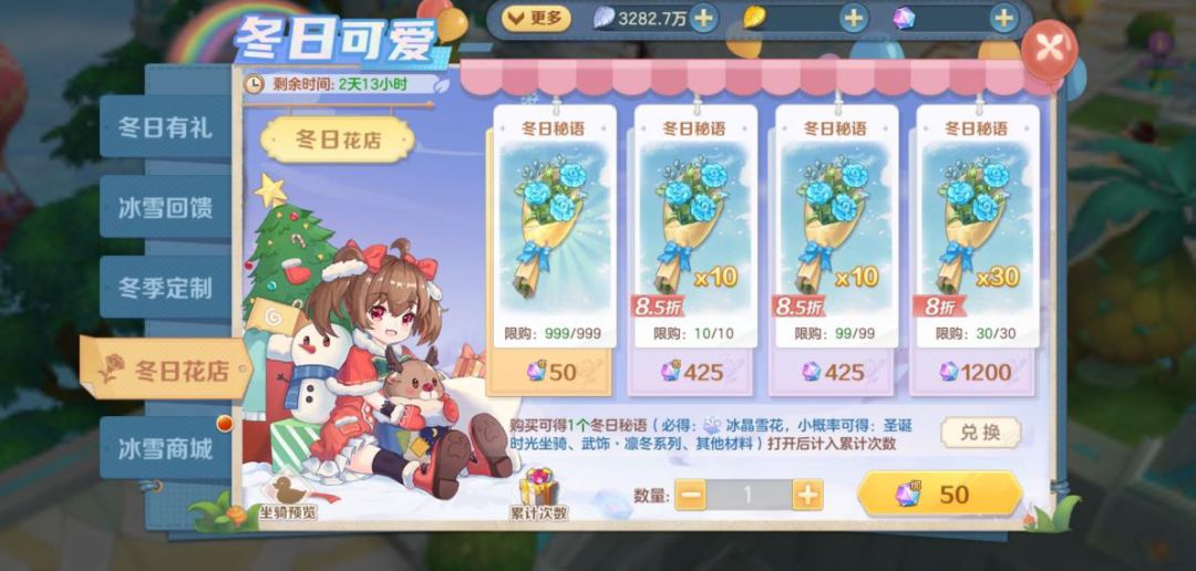 -购买可得1个冬日秘语(必得:出冰晶雪花,小概率可得:圣诞时光坐骑、武饰·凛冬系列、其他材料)打开后计入累计次数)