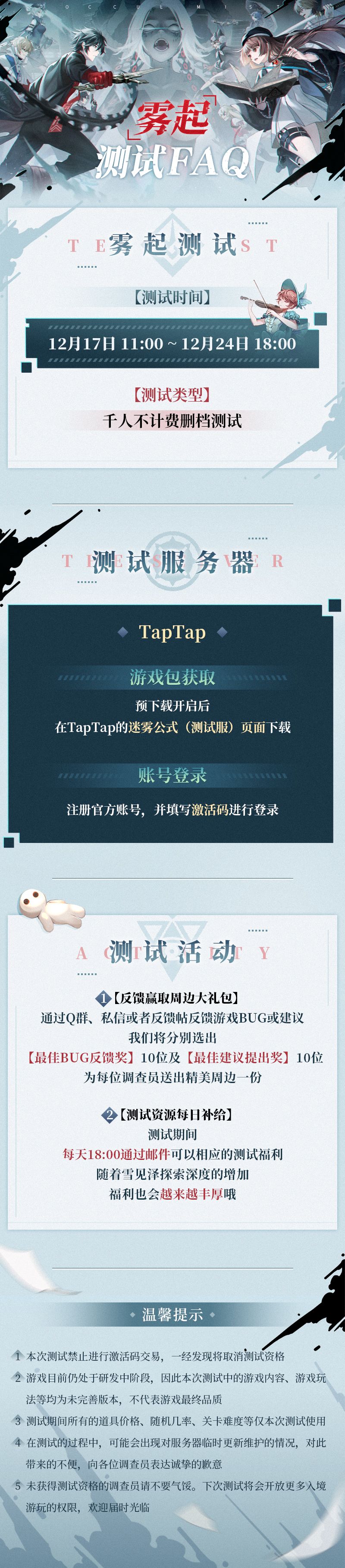 通往「雪见泽」的大门即将开启,「雾起测试」将于明日11点正式开启!在出发之前,请调查员先行查阅本次游玩的指南信息,谨记不要在隐里中走丢了。