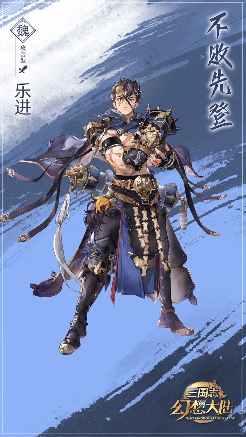 人设 | 乐进先天弱势的身体,同龄孩童的围剿,弱肉强食的世界,此间种种让他明白想要还击只能靠自己变强,于是他不断找人比武,屡败屡战,时日一久,附近再无人敢欺辱于他。他有着极强的胜负欲,成为曹操的手下后,身边良将诸多,每每与人邀约比武,赢了还好,但若是输了一招半式,他会时时挂念,整夜琢磨,并屡屡再找那人比试,直到胜出为止。作战时骁勇胆烈,常能精准判断形势,在战场上识破敌阵弱点,常为军中最早破敌的“先登” 。 * 以上内容概括自《三国志幻想大陆》设定