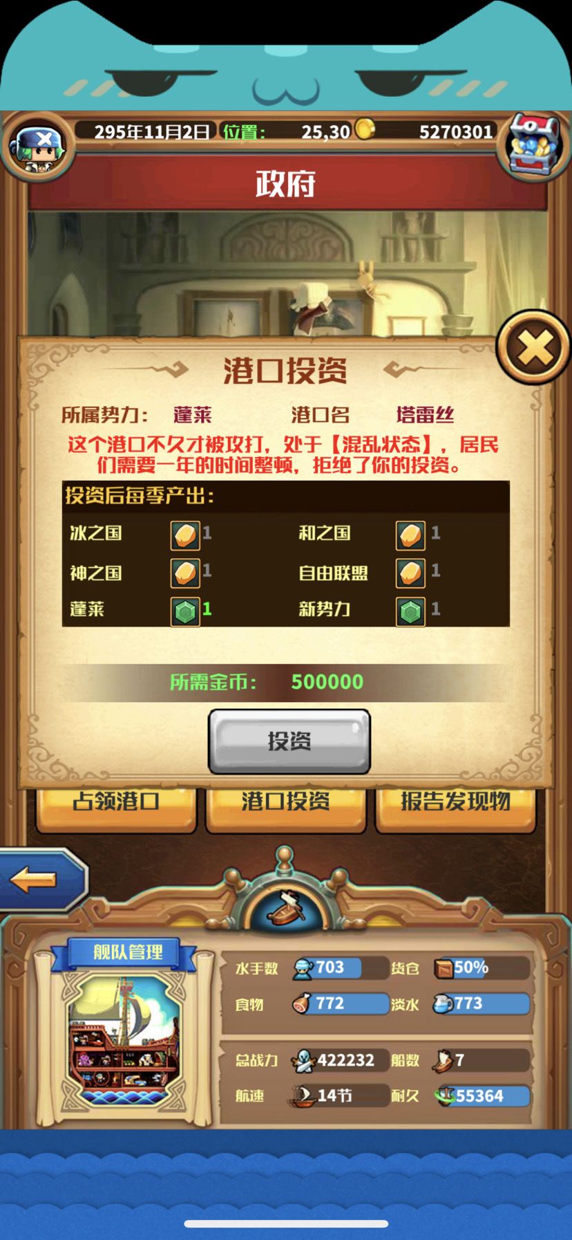 就一艘7级圣炮,船员还不满级,其他全是炮灰,就二个破盖伦还两下就倒,2381炮击跑去试试威力,结果发现只要打中就能秒,然后就一直读档调位置,只要对面旗舰在中间第二个,就能一发加强光子炮秒旗舰!SS港都打下来了,好像可以跳过龟炮直接出先民了,后面就是跑商等材料通关了!