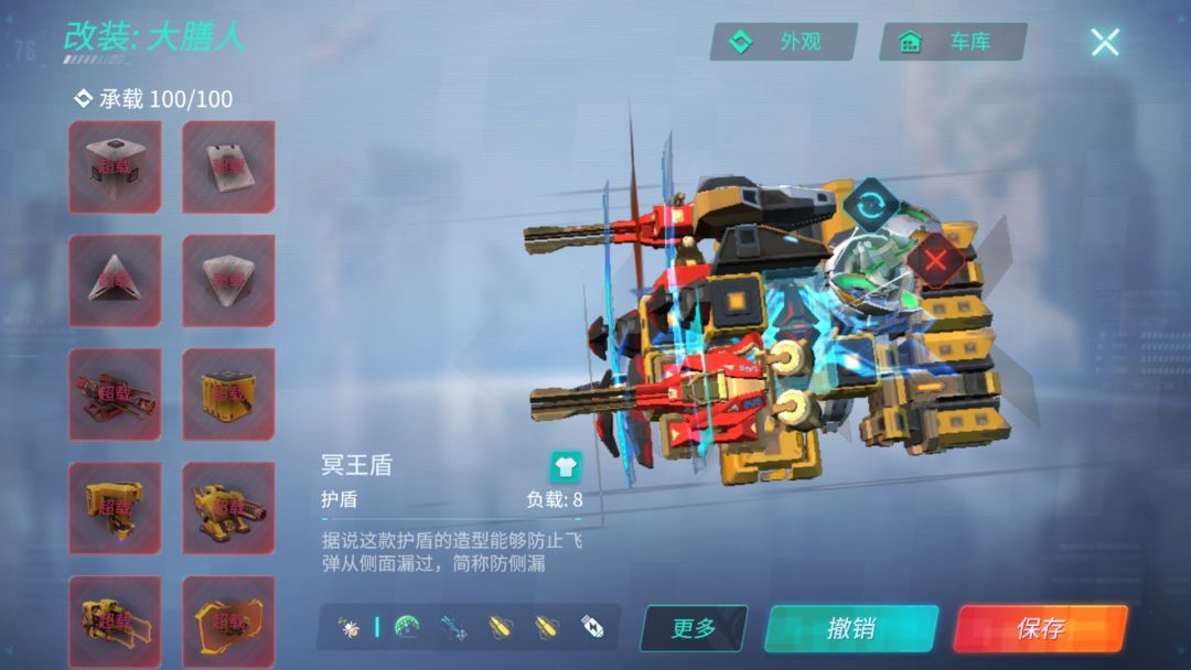 相比原版,将顶盾移至车体,有效保护了“一根”脆弱车体,防止被狙偷上面直接被解体;顶置机枪和激光分开,不会出现一个连接块掉了直接没两个武器的情况
