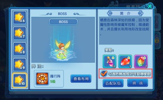 每周最多只能领取3次奖励(普通组与高级组通用),只有勾选了对应魔星星级的获得奖励按钮才能获得奖励,成功挑战BOSS后奖励会直接到背包,无需手动领取,而不同组别每个魔星的每个星级只能提供一次奖励(例如:勾选了普通组第一只BOSS的10星奖励,挑战成功并获得奖励后,再次挑战该星级的普通组第一只BOSS哪怕勾选了获得奖励按钮也是无法获得奖励)