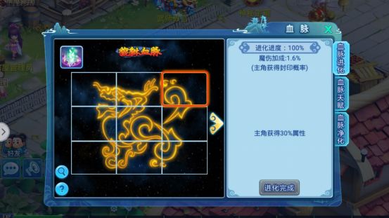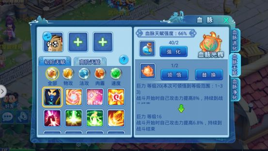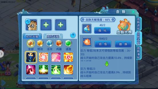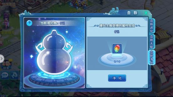 血脉净化可以通过净化石提升当前净化度,净化可以增加主角在血脉进化获得的属性加成比例(血脉进化主角初始可以获得对应血脉的20%属性加成,而该血脉觉醒后可以获得30%的属性加成)每次净化会提升主角可获得的血脉进化属性加成比例,而当净化度达到100%后加上血脉觉醒后的30%属性加成,可以获得高达60%的属性加成。