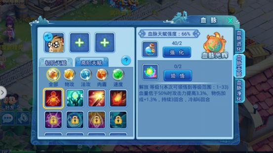 解锁后技能可以通过领悟来改变技能等级(每次领悟会从等级范围内随机出现,技能效果也会随着技能等级不同而变化,而每领悟29次会触发领悟保底,保底时等级会缩小在高等级范围内),技能等级范围则会随着血脉天赋强度提升而增加上限(最高50级)