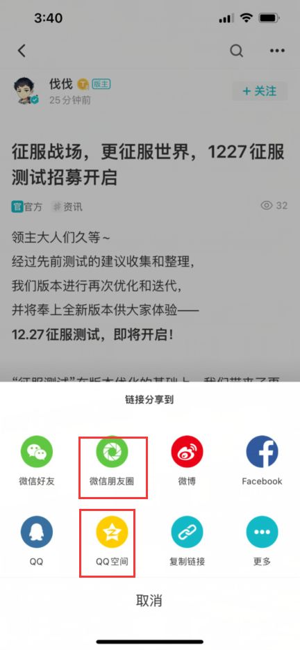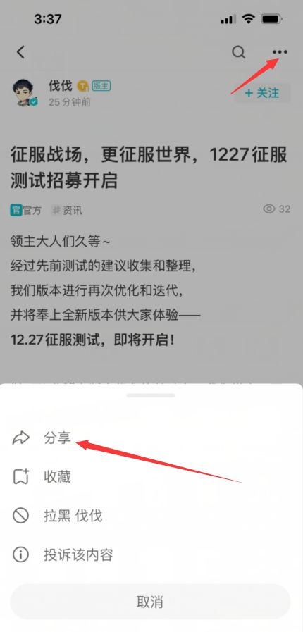 点击 征服战场,更征服世界,1227征服测试招募开启 文章右上角的三个点