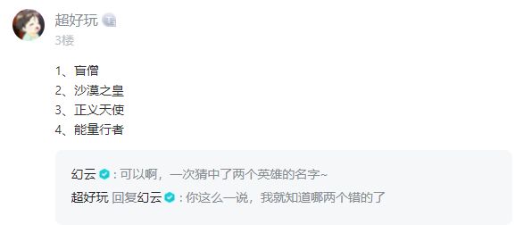 恭喜“超好玩”猜中了“正义天使”“能量行者”两位英雄的名字,获得20元话费奖励~