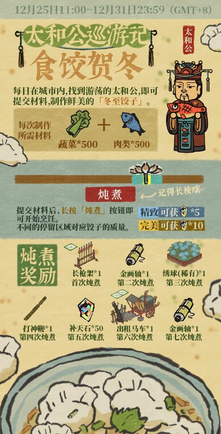 在城中找到太和公,提交食材烹饪饺子即可领取丰富奖励。