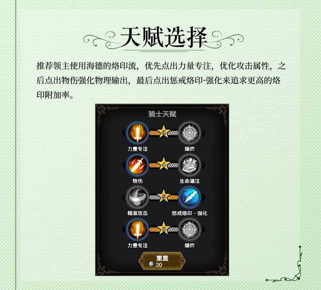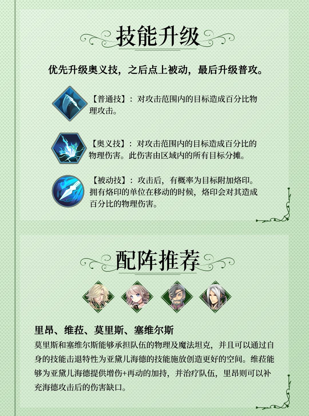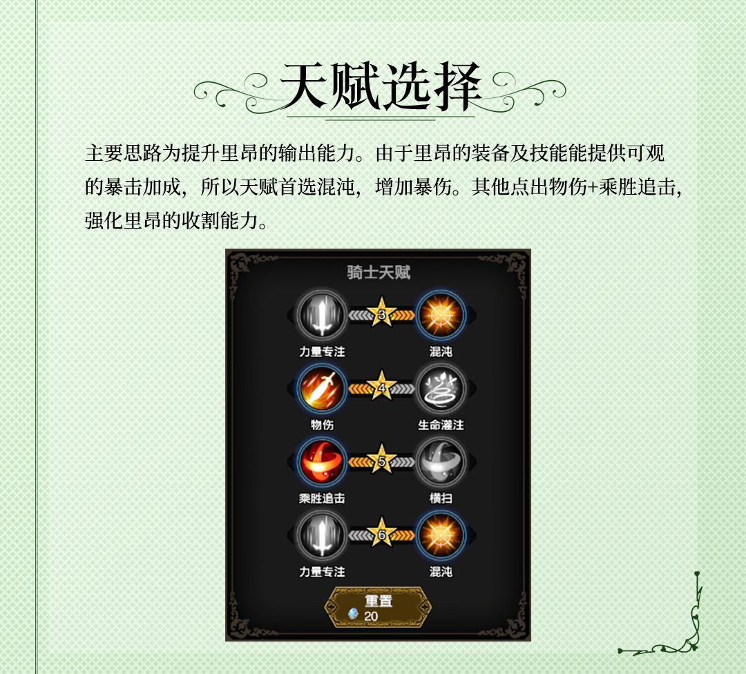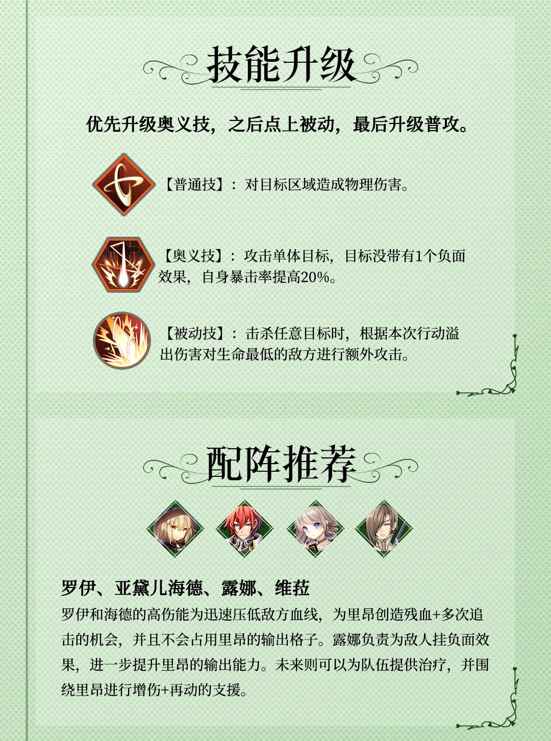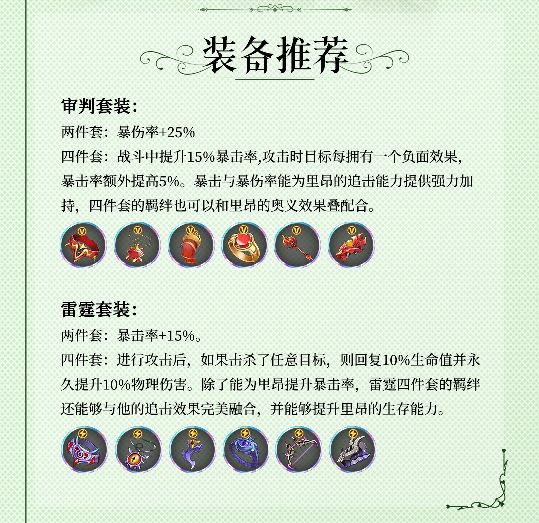 里昂拥有不错的输出和收割残血的能力,作为一个输出型角色,里昂会成为领主大人们关注的焦点。如果您在游戏中抽到了里昂,建议您一定培养起来,即可以其为核心进行阵容的组合。