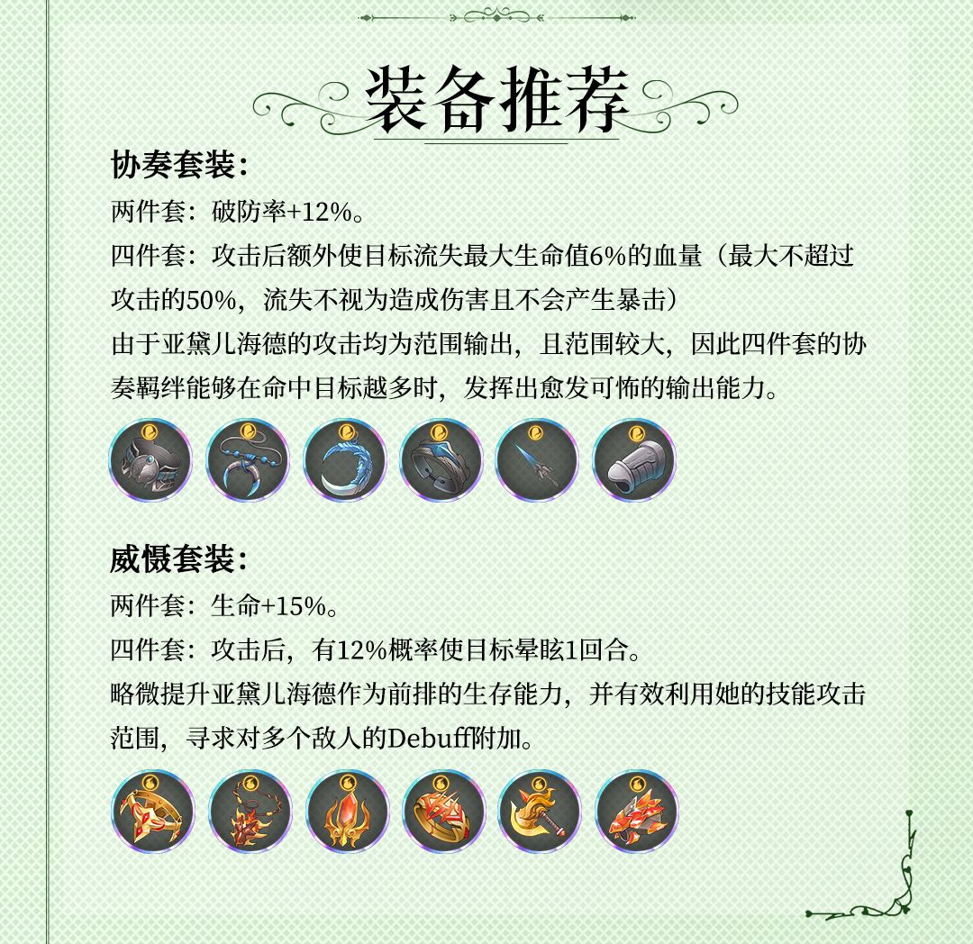 亚黛尔海德是一名稳定的输出型突属性骑士,大招的伤害分摊可以不让伤害溢出,保证了稳定的输出环境,另外被动的二次伤害对会让一些“小短手”十分头疼。