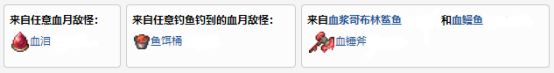 除嗒嗒牙齿炸弹和血乌贼外,所有钓鱼钓到的敌怪均有概率掉落鱼饵桶,所有敌怪均有小概率掉落血泪,血浆哥布林鲨鱼和血鳗鱼会掉落血锤斧