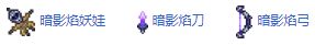 暗影焰刀:近战武器,发射暗影焰刀射弹,击中敌怪后造成暗影焰减益并反弹,反弹2次后会消散,击中物块后会直接消散;