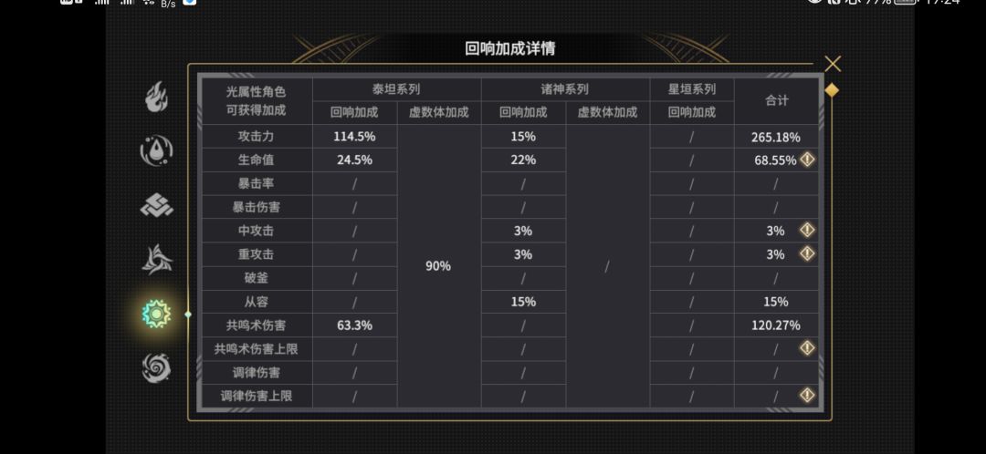 首先我们是泰坦盘,那么我们的虚数体加成就是泰坦加成。泰坦盘的回响加成公式为总计值=泰坦系列回响加成*(1+泰坦系列虚数体加成)*(1+诸神系列回响加成)+诸神系列回响加成。以第一行攻击力加成为例,114.5%*(1+90%)*(1+15%)+15%=265.1825,即为总计值。