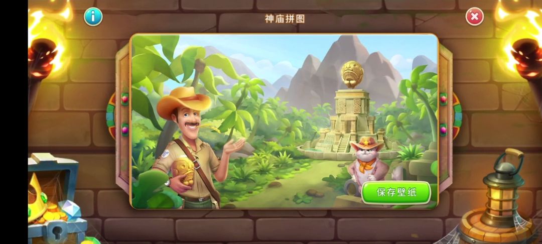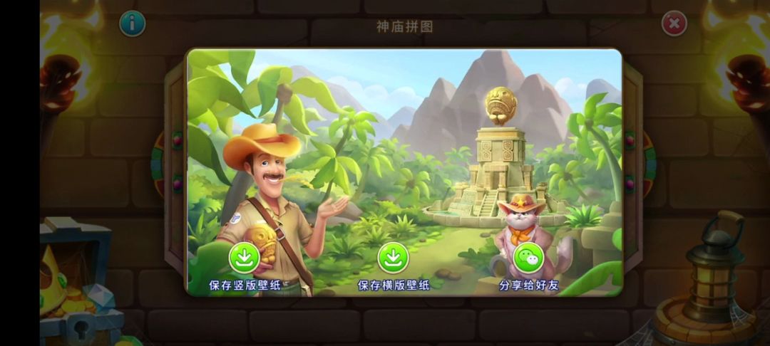只要闯过9关就可以玩拼图,拼图完成的图案如下图所示,拼完可以获得手机壁纸,可以自由选择横版或者竖版进行保存!如果想和好友分享获得的壁纸,点击保存壁纸按钮后也有分享按钮!