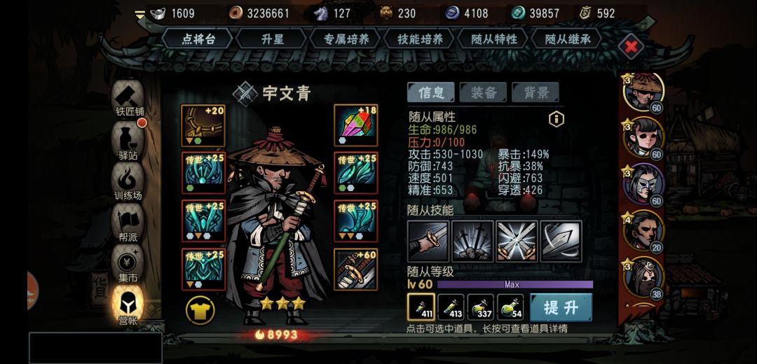 随从1技能拥有最高增伤(对流血、裂伤额外追加90%伤害),而且这里流血、裂伤加成都是单独计算的(不懂是不是游戏bug)。宇文青和墨仁有裂伤,墨仁还有流血效果,按照1000攻击2层易伤来算,1技能满级170%伤害加成1000x1.7x1.9x1.9=6137,暴击后可达到12000的输出,当然这里是理想值,毕竟怪物还有护甲伤害减免,人物伤害还有最大值和最小值。这里还要谈下最强输出套装狂怒套,暴击伤害提高100%,我现在墨仁穿的狂怒套伤害面板只有400-770,双易伤后暴击最好一次可以打出9200的伤害。