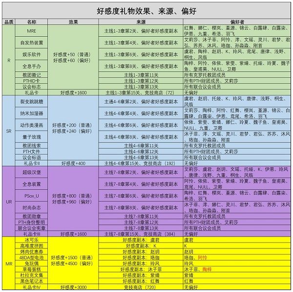 礼物分为四个档次,分别是绿色,蓝色,紫色,金色,其中各类礼品卡为通用礼物,其他礼物存在偏好,使用会多20%的加成(金色礼物偏好加成为200%)。