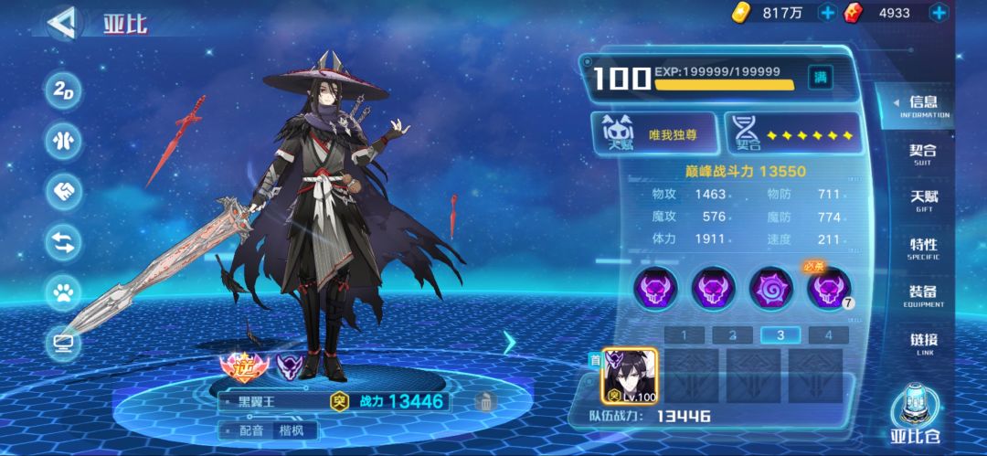 我们先看面板:满速211,配合魔王呼啸的+10速度,局内速度基础值221,ban掉帝龙,除却开状态的黑麒麟,黑翼王是竞技场第一速。