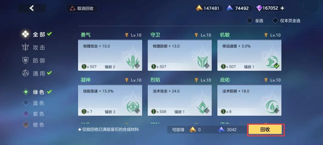 回收功能只对满级星石有效,可以将满级星石的多余星石分解为星砂