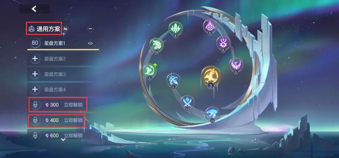 三、方案优化本次星盘改版新增了英雄专属方案,与通用方案不同的是,英雄方案里的每个英雄都有一页系统方案。