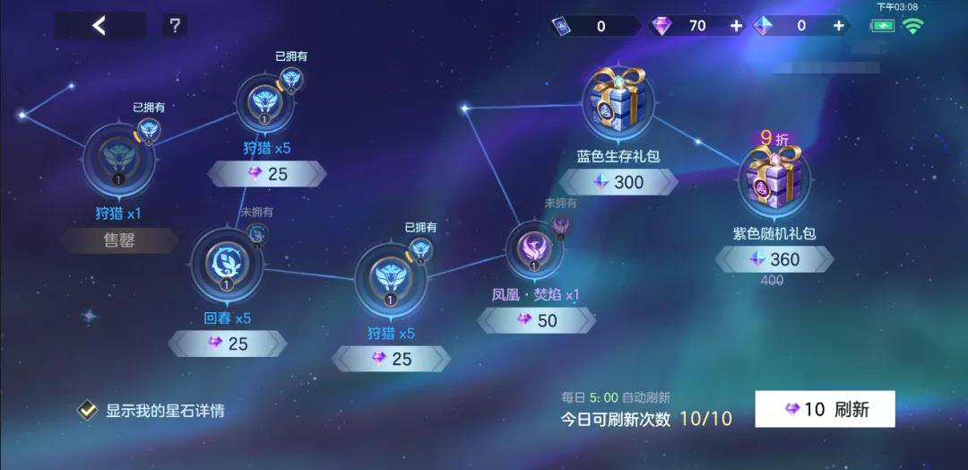 星石商店栏位数量由六个变为七个,其中前五栏售卖各种品质星石,用钻石购买;后两栏会售卖星石礼包,用龙晶购买