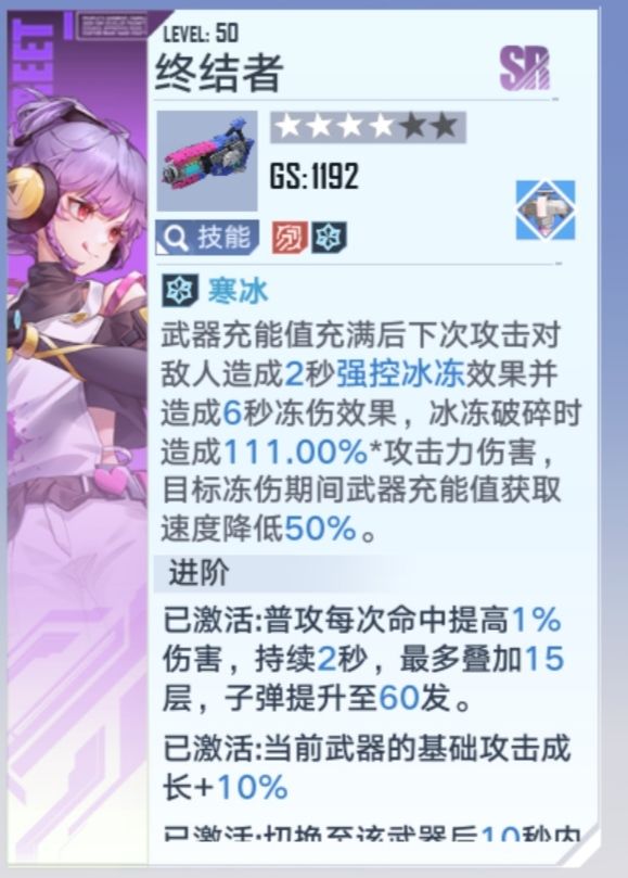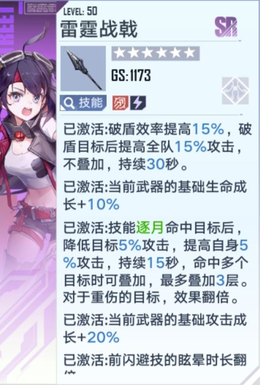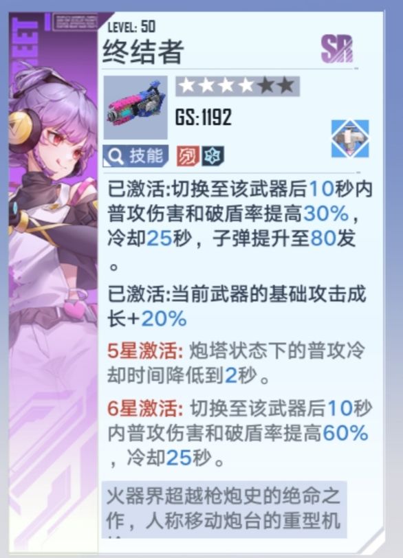 偏向输出的sr武器,满星输出还可以,但是破盾能力太差,可以依靠破盾效率高的武器破盾搭配输出,比起ssr输出还是有一定差距,但是你没有好的ssr输出武器的情况下,这是sr里面的首选,其他sr武器都有一定的缺陷,或者说根本不是用来当主武器使用的