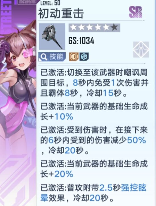 而且3星还有受到伤害时减少50%的被动效果,5星附带眩晕,作为防御型武器可以在低血量时提高生存并且辅助输出,当然其输出能力太差,不建议当做输出武器使用。