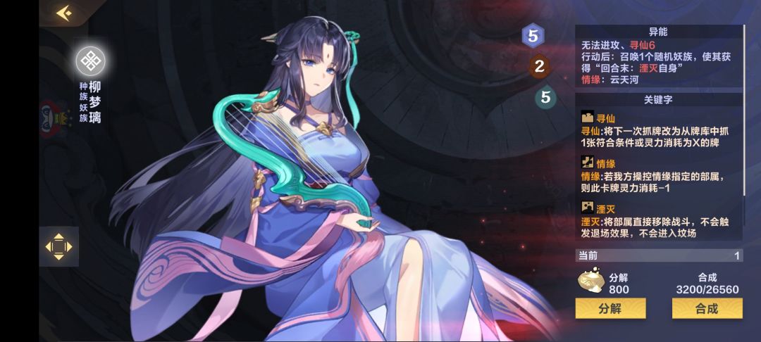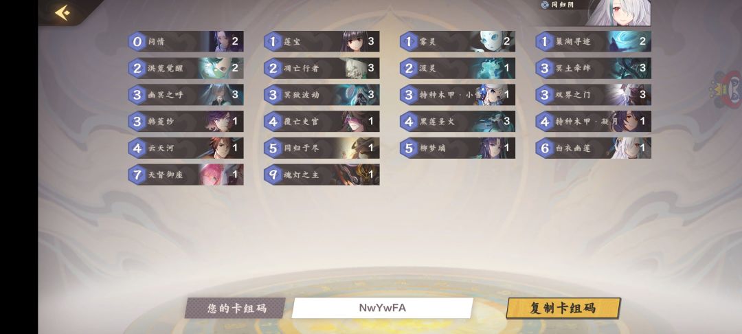 同归于尽的核心就是白幽莲!只要我们的白幽莲站场,那我们就立于不败之地!所以如何稳定入手白幽莲是问题的关键!这里柳梦璃就成了非常关键的卡了,因为高贵的寻仙6啊!太难得了!😂那么问题又来了,怎么稳定入手柳梦璃呢?那就要问巢湖这张神卡了,直接检索妖族,卡组只带梦璃一张妖族,保证100%稳定入手!那要是巢湖沉底呢?所以我这里准备了双保险,两个路线寻仙梦璃,极大保证梦璃入手的概率!简单来说就是菱纱寻天河,天河寻梦璃,梦璃寻幽莲🤣有点绕哈,但是这些都是关键牌,不止是为了入手梦璃和幽莲这么简单的功能,之后请听我再慢慢道来。