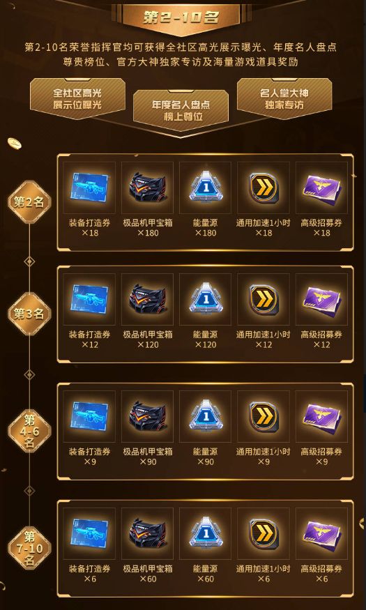 获得2-10名的荣耀指挥官们,均可获得社区高光展示曝光、年度名人盘点尊贵榜位、官方大神独家专访以及海量游戏道具等奖励