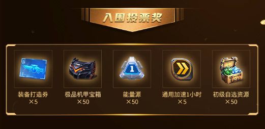 入围投票奖(票选用户最终进入榜单前十 )的指挥官们,可以获得装备打造券、极品机甲宝箱等游戏道具奖励。