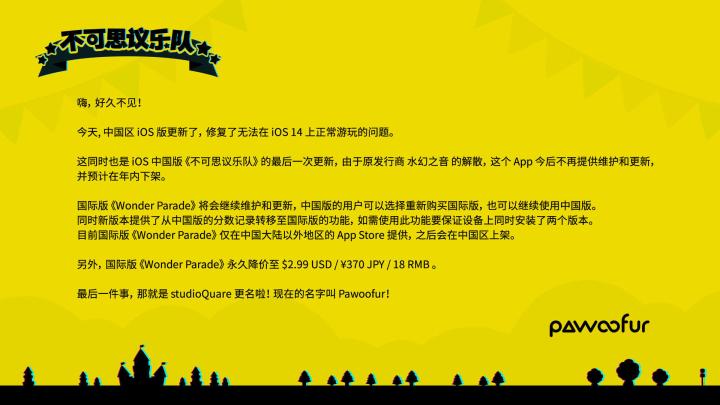 《不可思议乐队》我比较喜欢的音游,但是得知团队解散我很伤心,今天刚买就发现今年要下架了,也希望能保留住国服,别的团队继续接管,毕竟让我这么喜欢的游戏不多了,但我又有什么办法呢,大家可以把注意力转到国际服啦,刚买的可以先退款啦,可以把游戏资源转移到国服啦,永远记得《不可思议乐队》祝大家新年快乐!也祝愿大家游戏愉快!(体验玩家评价😃😃😃)