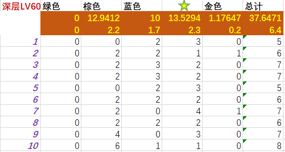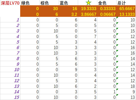 深层lv70和迷宫lv50恰恰相反,绿色不出,棕色和蓝色资源出的数量比迷宫LV50的高一点点。主要出⭐,出货量占总体的30%左右;出金概率为5%左右。