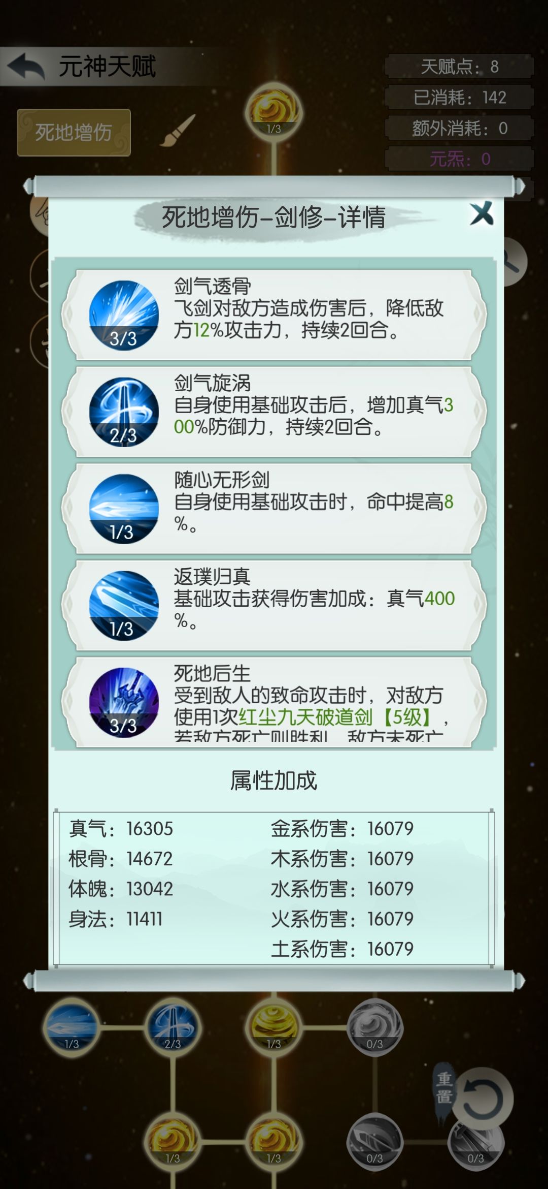 注意:想用剑天赋死地一刀流,要保证会心,十万,献祭,血祭,技能全有,且等级都比较高,不然还是用兽天赋会心主五比较好