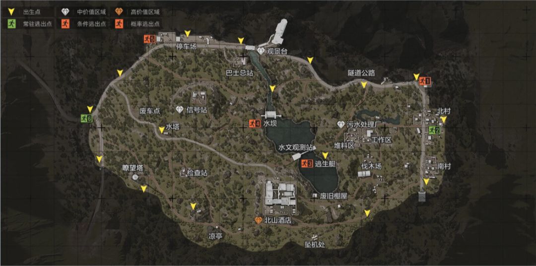 以“水坝”为中心将地图左右分为两个区域可以看出来地图下方以及右侧的危险系数是比较高的,另外“伐木场”“观景台”“信号站”这些地方也会刷新很多AI,地图地形的优势让“莫辛仔”也可以在地图中大放异彩,总体来说北山真的是处处存在着危险。